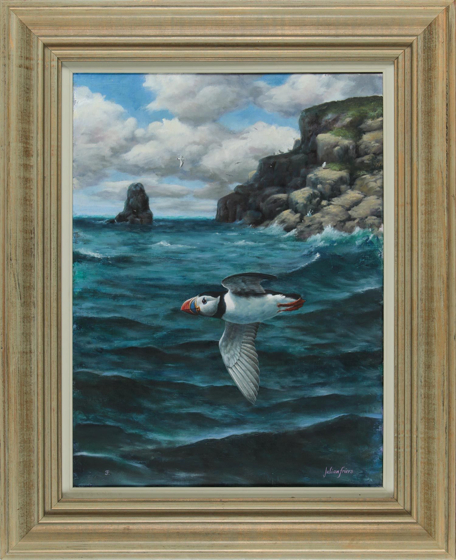 This is a large and superb Painting by Julian Friers RUA of ‘Puffin in Flight’. It is Oil on Canvas and Framed. The Painting is in excellent condition and signed lr right. Julian Friers was a wildlife painter born in Bangor, Northern Ireland in 1956. Friers was educated at the Belfast College of Art and then to earn a living, he became a professional wildlife painter. His first solo exhibition was held in 1977. In 2009, Friers was appointed President of the Royal Ulster Academy. Today, we can see his works through collections in Germany, Saudi Arabia, Morocco and the USA. Friers Paintings are very sought after and can achieve very high prices. He is famous for his pintings of Birds especially birds of prey.