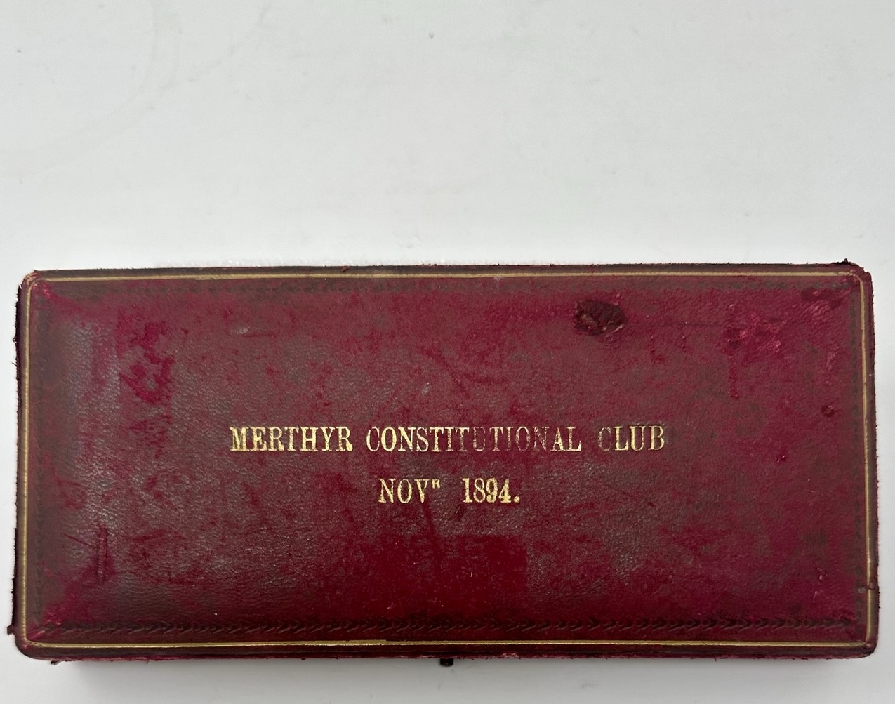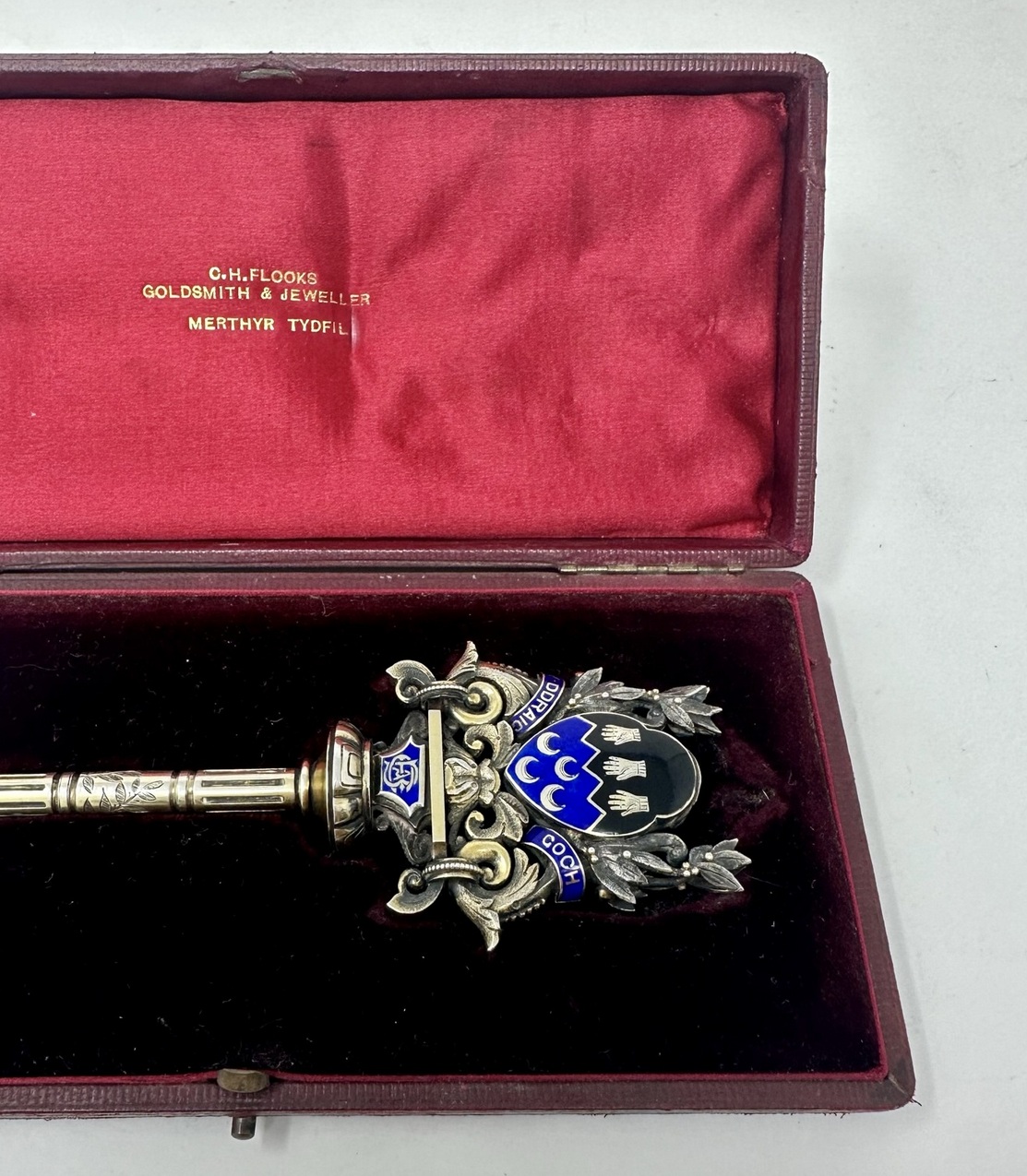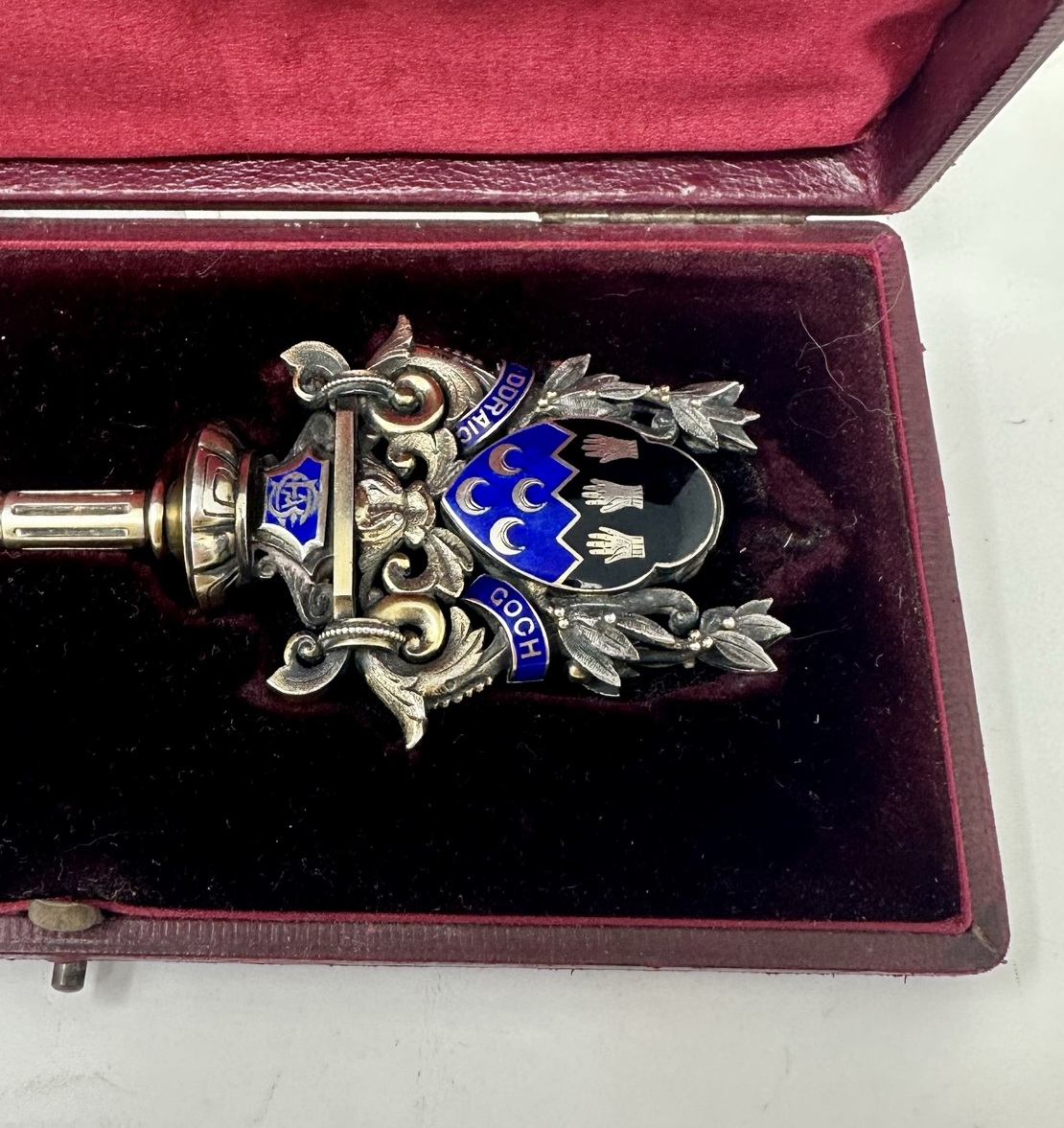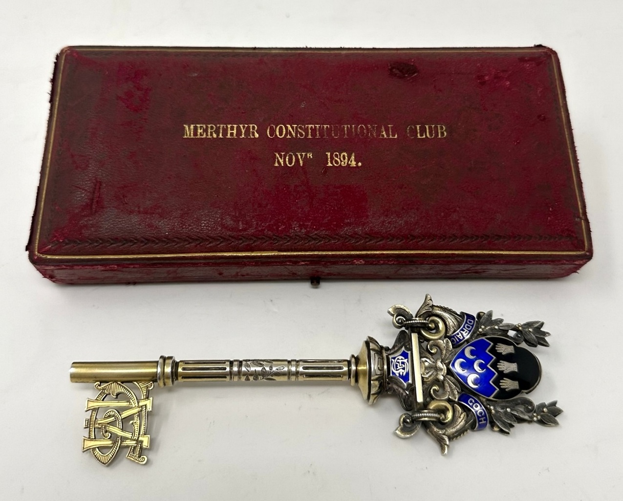 Rare Silver Gilt Presentation Door Key modelled for the Merthyr Constitutional Club in Wales, England in 1894, complete with its original silk lined box.