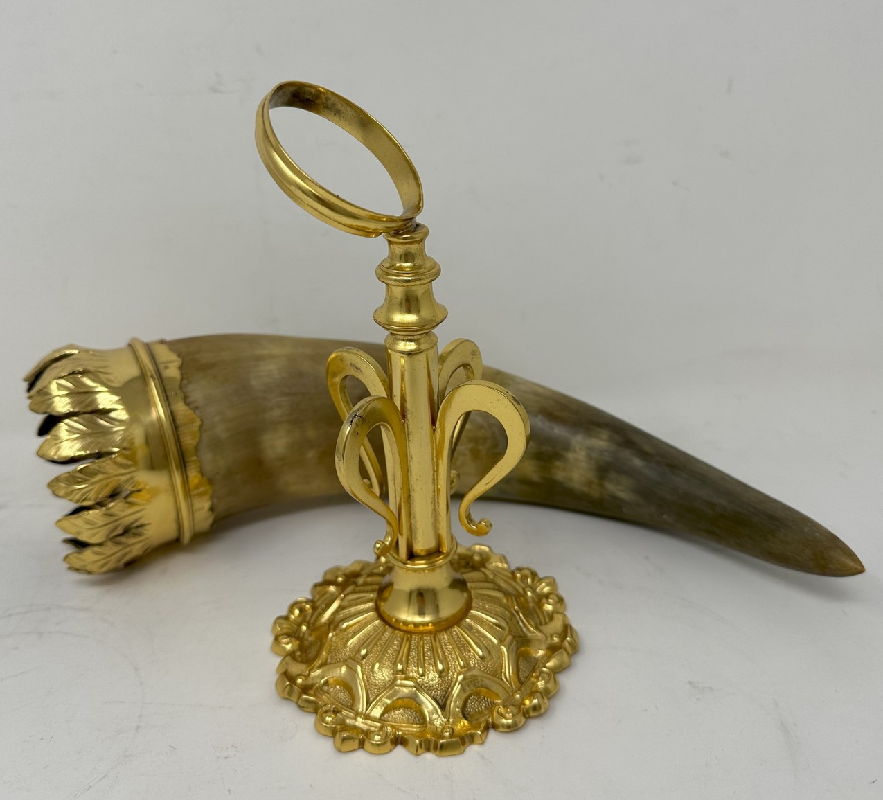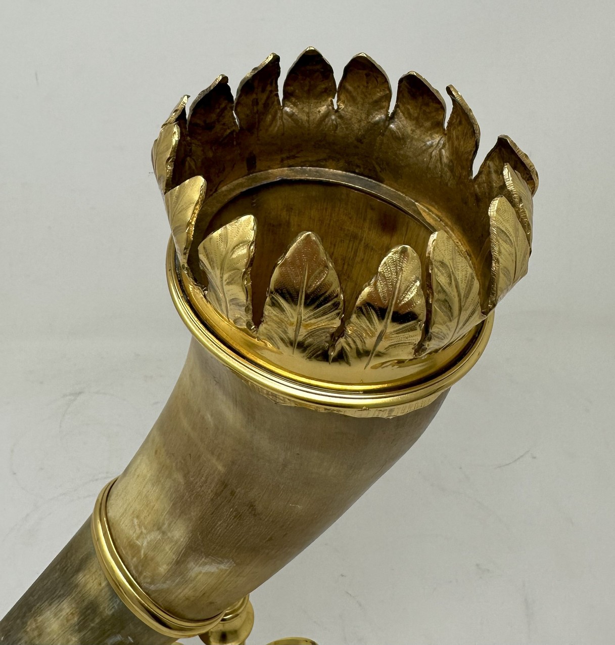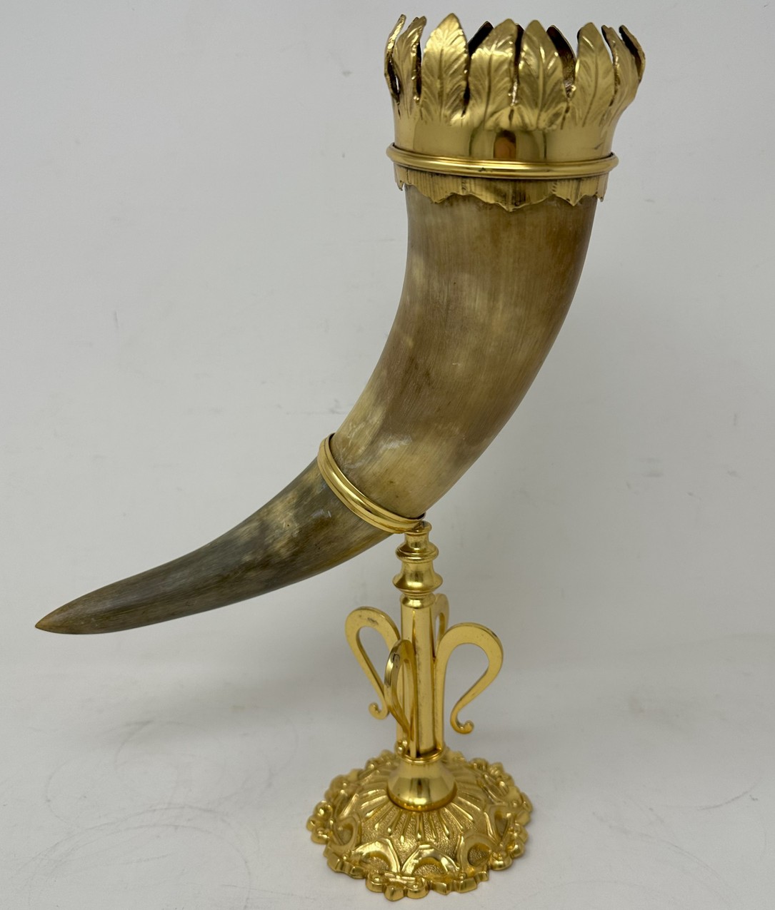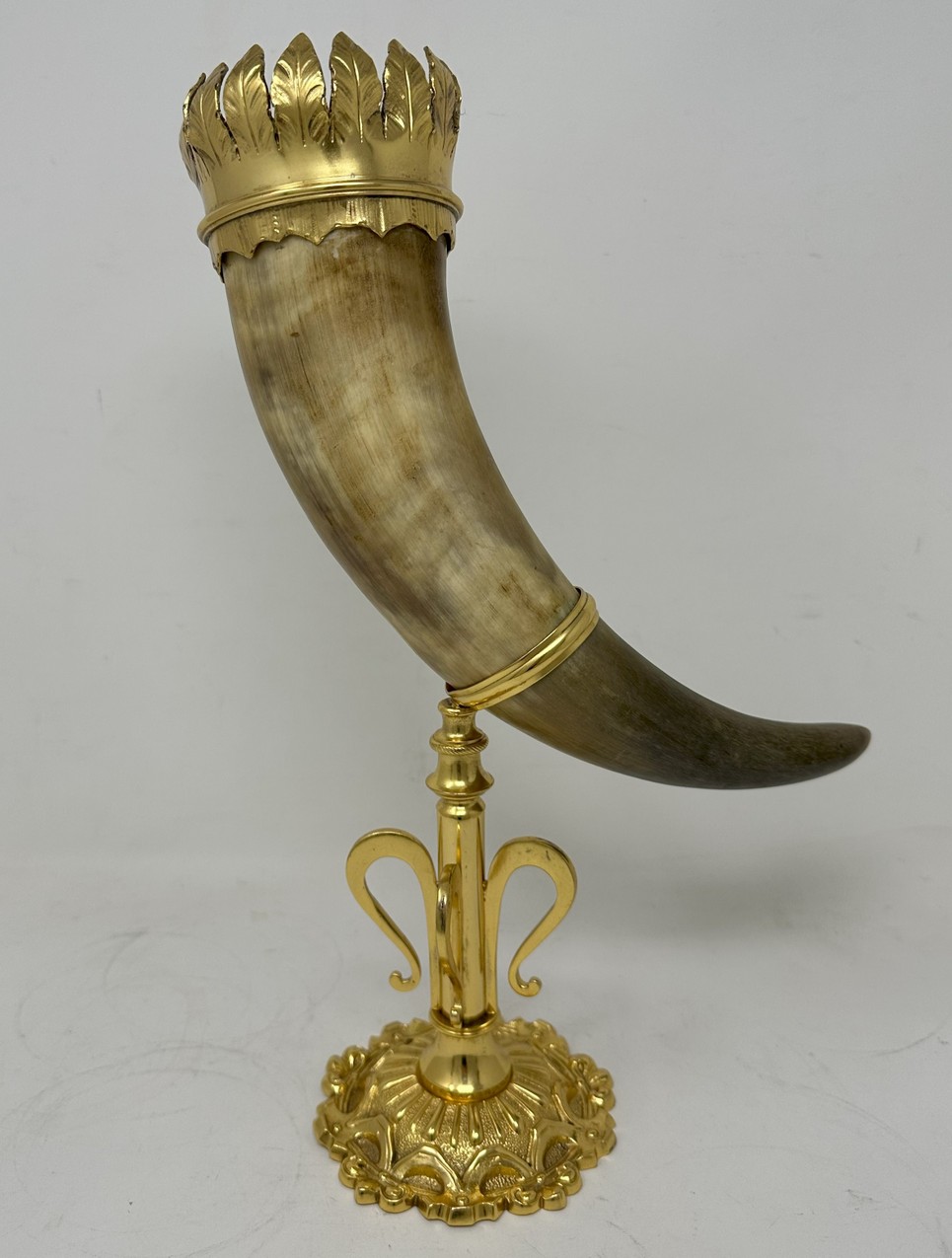 The unusually large horn with a wide ormolu band with leaf decoration, mounted on a very ornate stand with a central slender stem ending on a circular spreading decorative base.