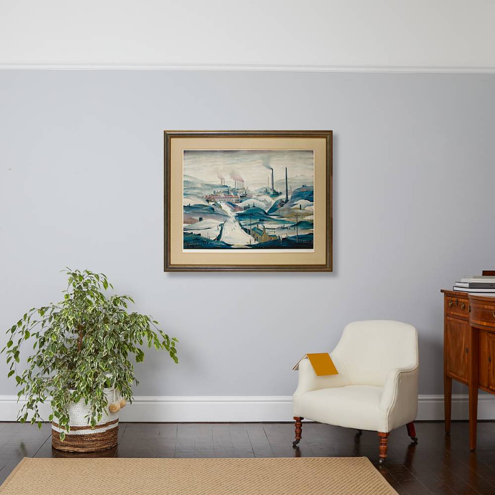 This is a rare Signed Lithograph of a dramatic landscape by LS Lowry (1887-1977), ‘Industrial Panorama’. The scene is a combination of several areas around Lancashire. The original painting is held in the Castle museum, Nottingham. This is number 278 as indicated beside the Guild Stamp (CJJ) from an original set of 300 signed by Lowry in Pencil lower right. This rare edition serves as a window into Lowry’s world where industrial scenes are rendered with unparalleled depth and emotion. It’s an opportunity to own a piece of British art history and is in excellent condition. L.S. Lowry is renowned for his captivating depictions of urban life amidst the industrial revolution, this piece showcases his signature style – a muted yet evocative palette that perfectly captures the essence of an era. Framed and please note the dimensions.