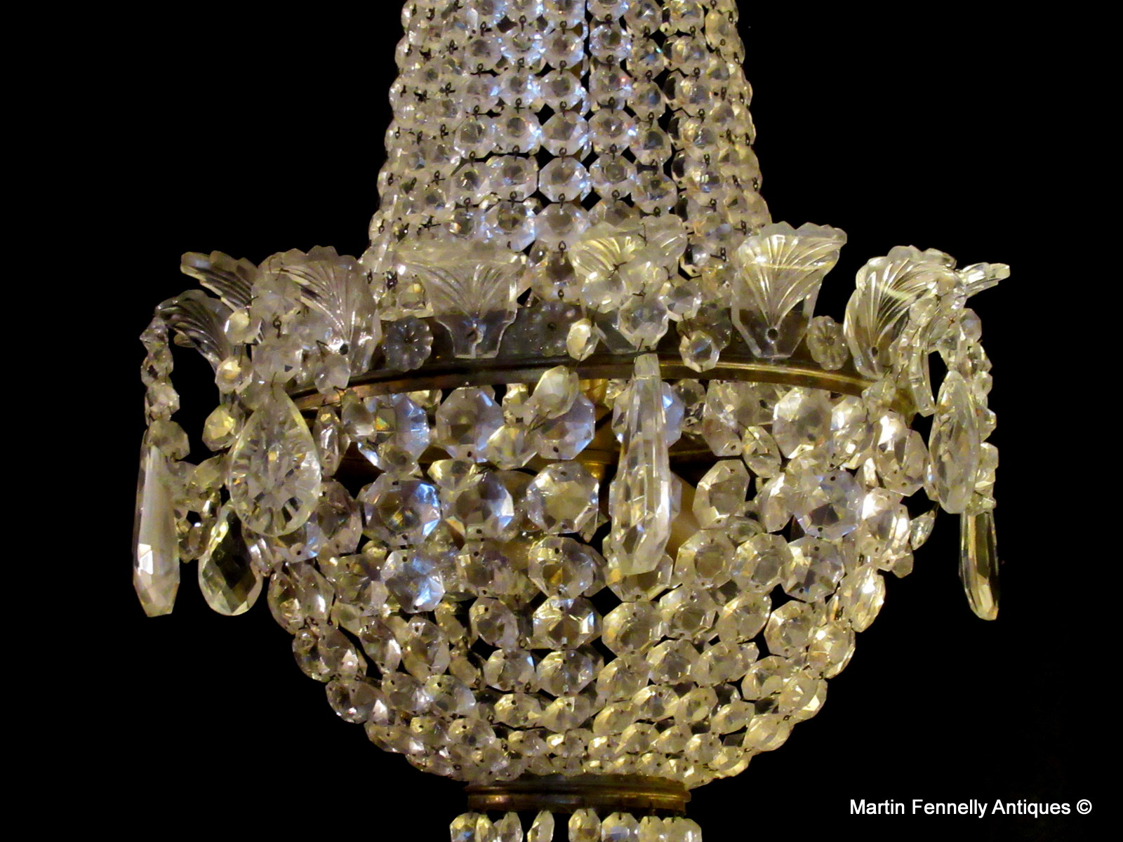 This is a very stylish Edwardian Chandelier dating to Circa 1900 and in very good condition. The chandelier has all the original drops and has very elegant ‘tent and bag’ design.