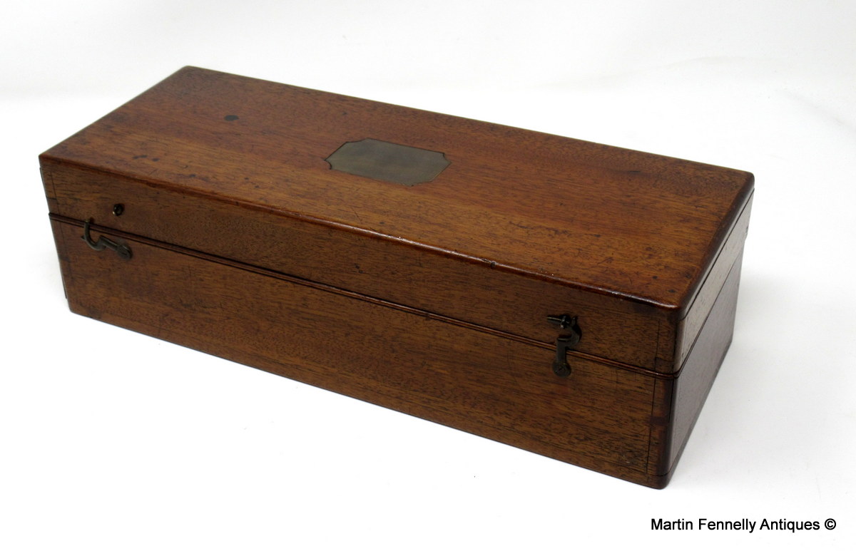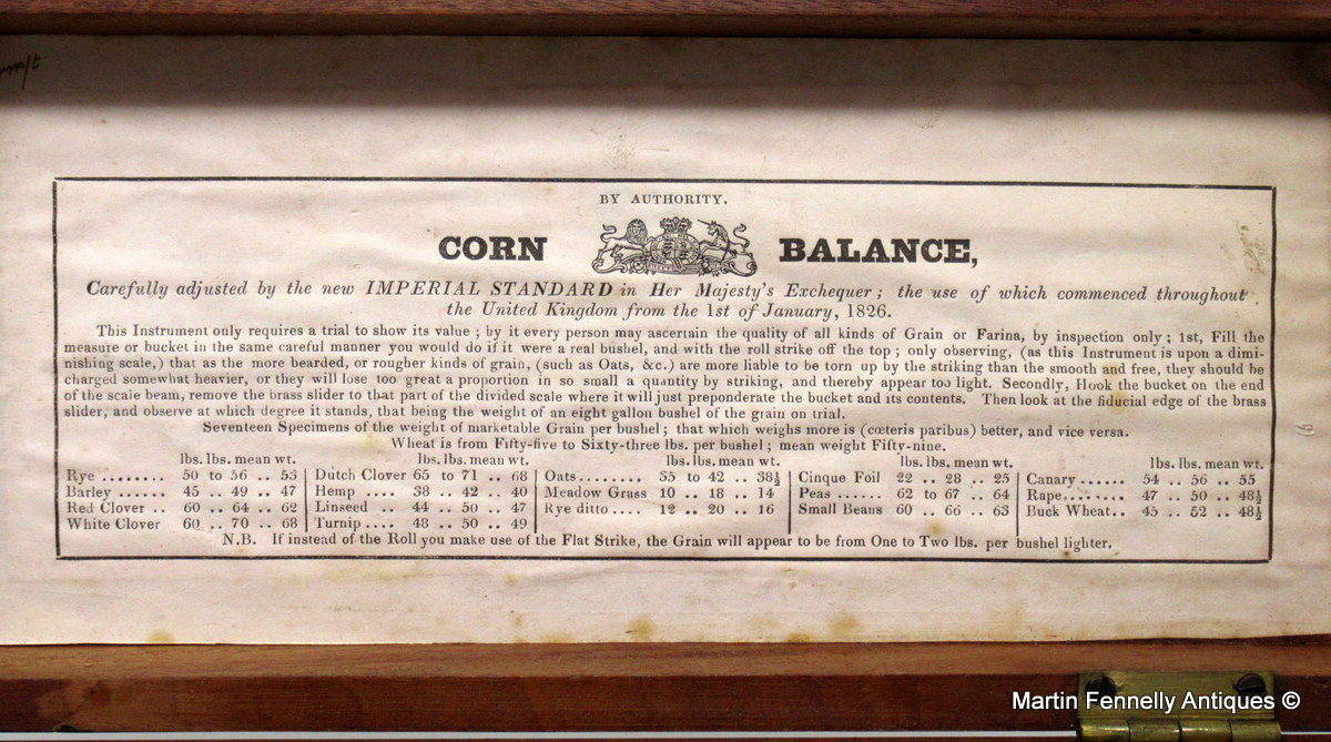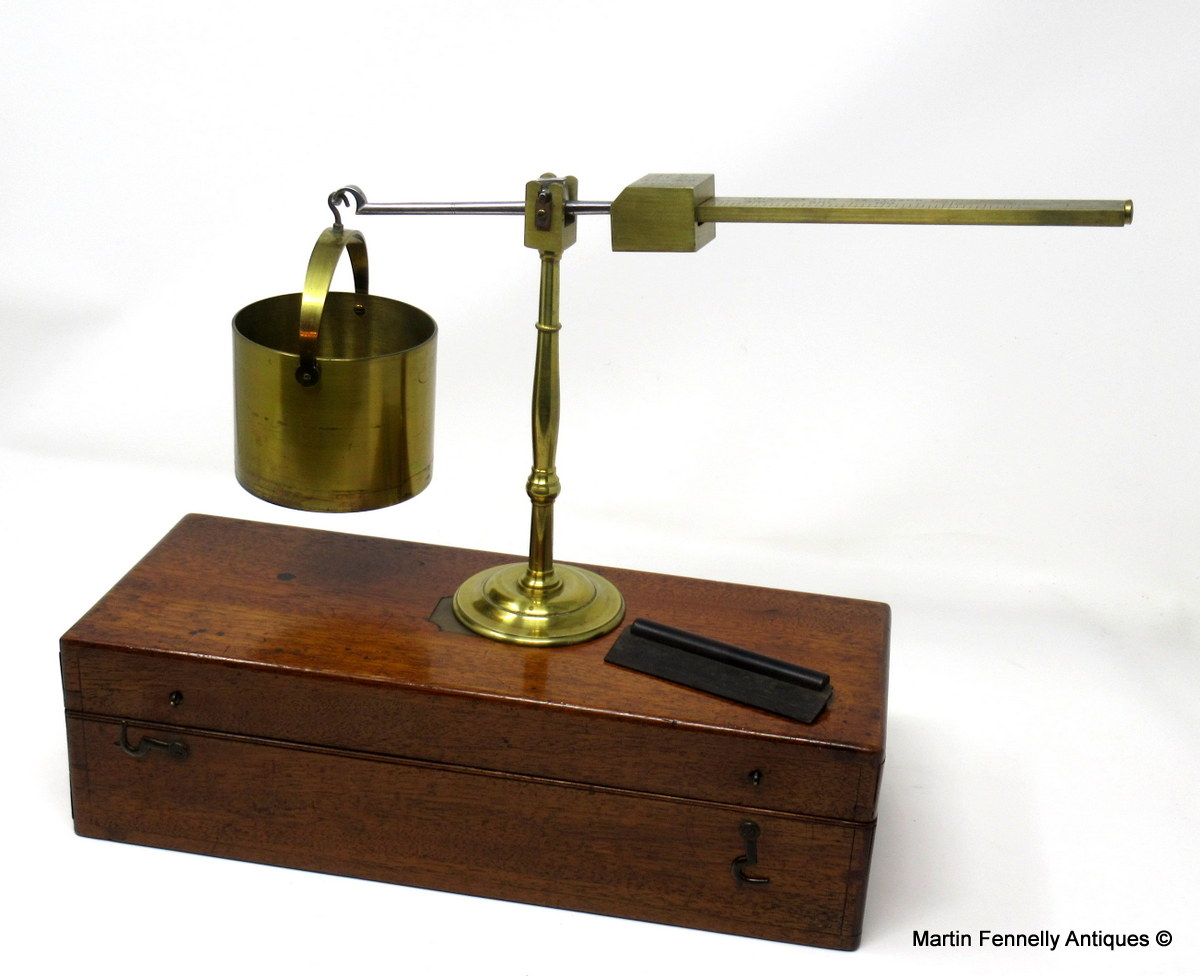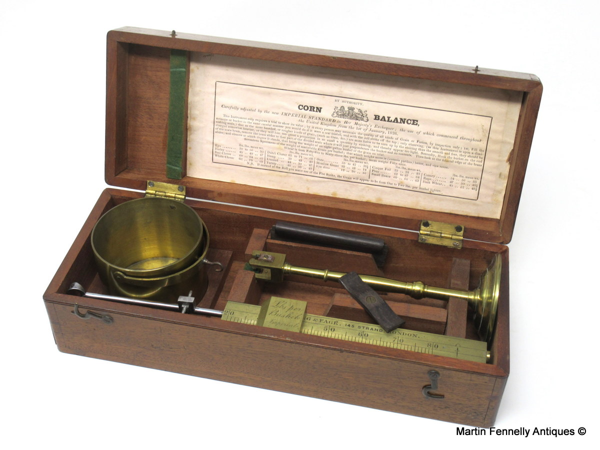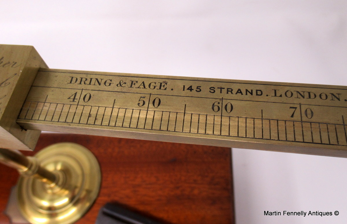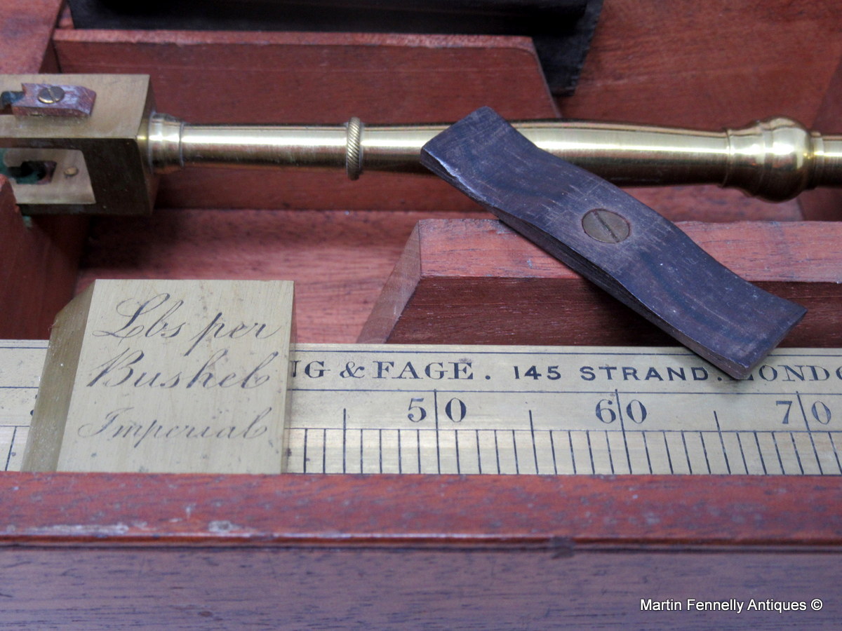 This is one for the Grain Growers A Chondromter by the famed Dring & Fage, 19 & 20 Tooley Street, London in the original mahogany hinged box with Ivory plaque to the top and paper label to the inner lid enclosing a lacquered brass scale; complete with original scrapper and signed on the balance Dring & Fage London. Here is the clinical meaning of Chondrometer ‘A chondrometer is a measuring instrument designed to determine the bulk density of grain. Grain density is measured in kilograms per hectolitre (Imp. pounds per bushel). It is thus also referred to as the hectolitre mass.’ This is a real curiosity and would make a very interesting gift for that Grain Farmer or instrument collector in you life. It is great that it is still complete.