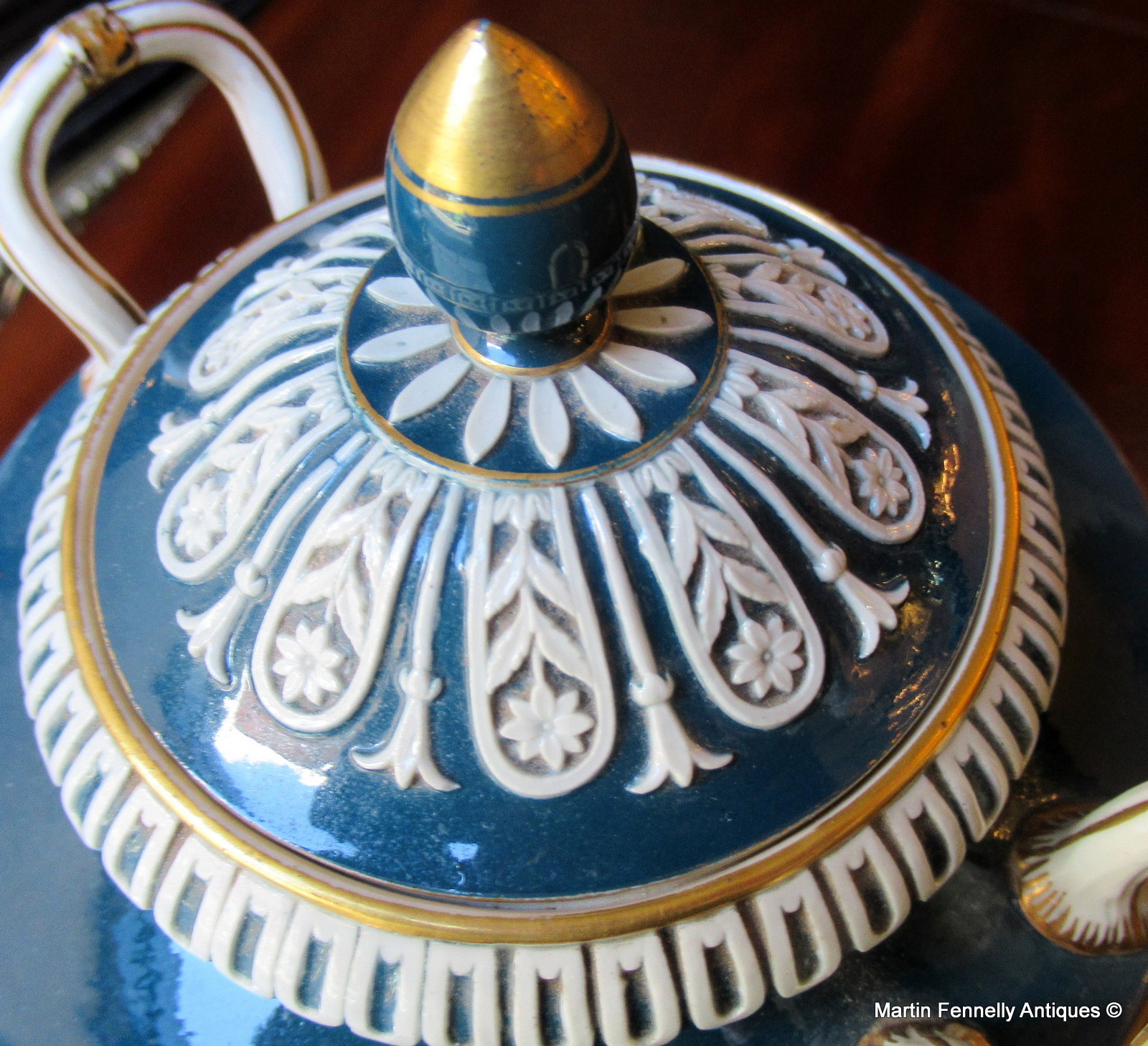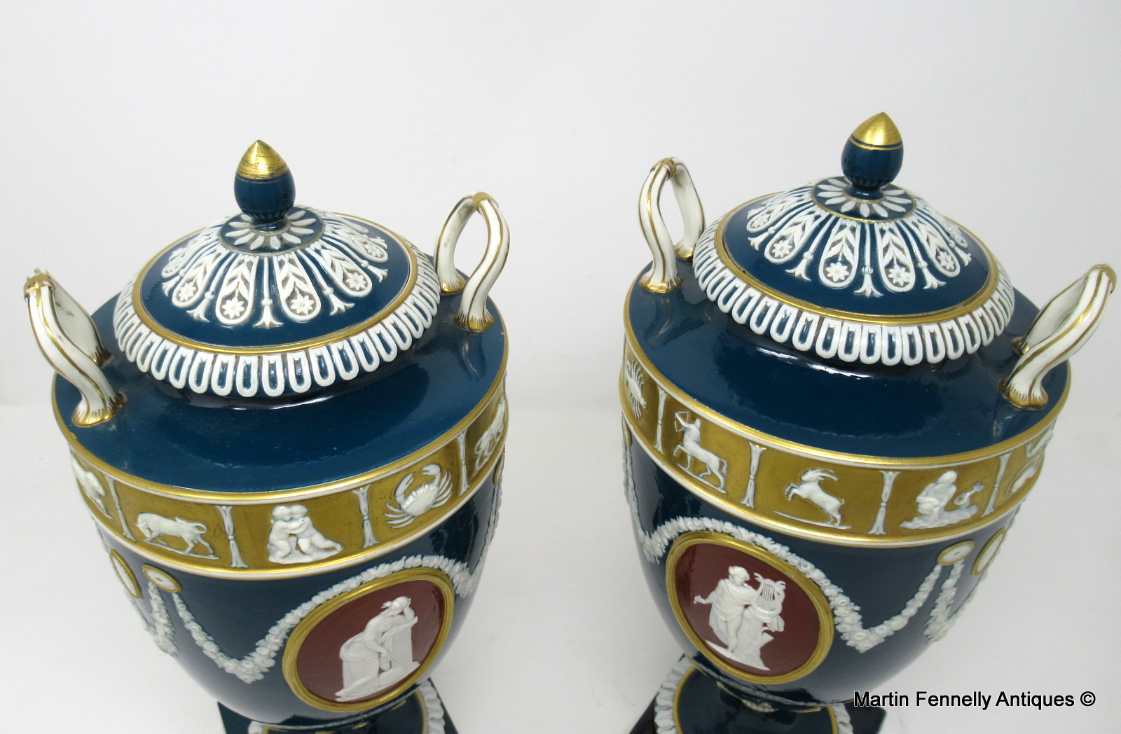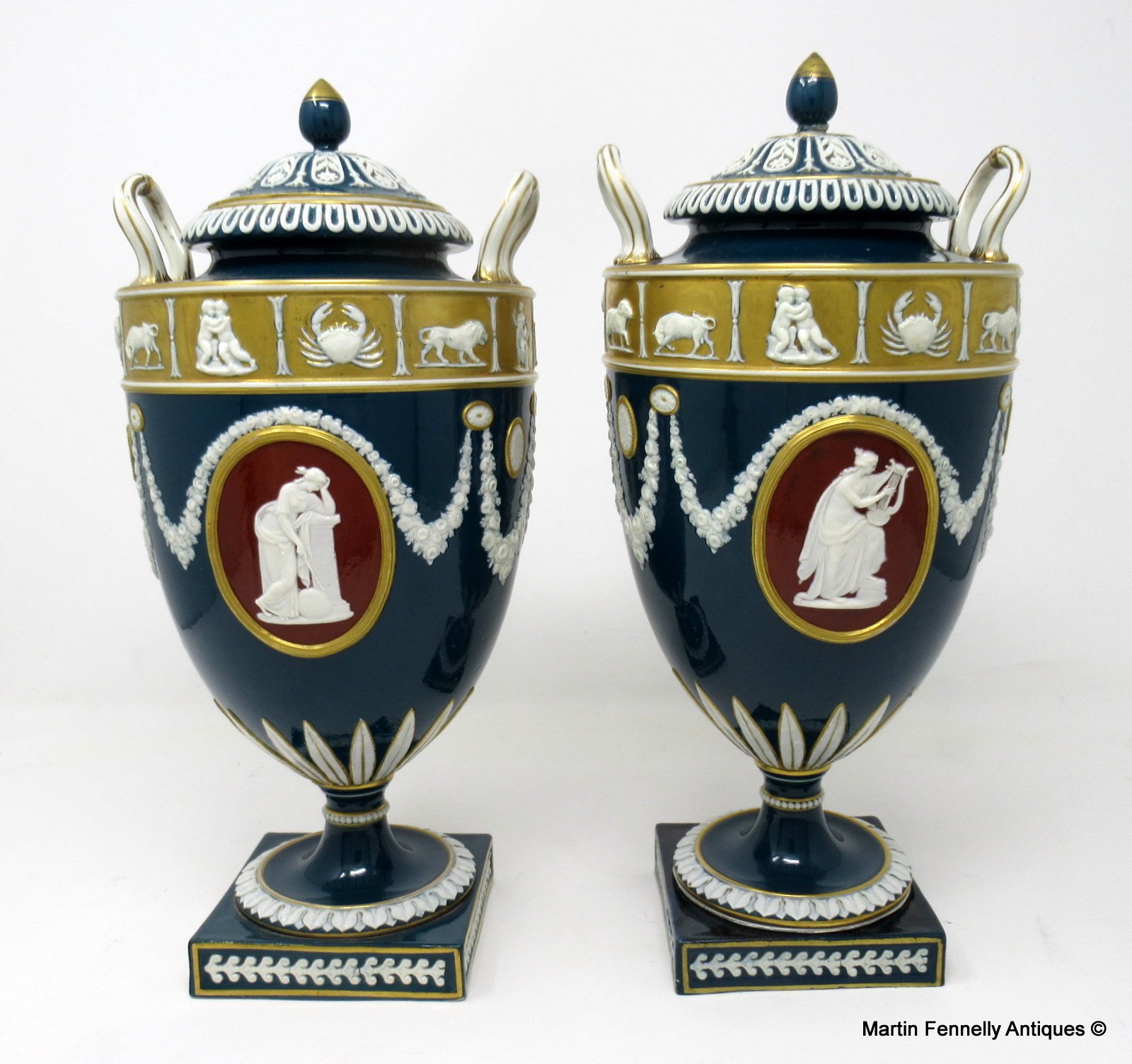 These are a spectacular Pair of Wedgwood Lidded Urns dating to Circa 1875,designed by Charles Toft and a very rare pair these are. ‘Victoria Ware’ from Wedgwood at its very best and in great Condition. They date to Circa 1875 and have a superb presence. They have the impressed factory name “WEDGWOOD” and are baluster in shape, decorated with ribbons of Garlands, floral festoons, full circle of Star Sign decoration and cameo styled medallions on each side featuring portraits of Venus and Neo Classical figures. These are a tour de force of Victoria Ware and bear all the hallmarks of the famed Charles Toft. Charles Toft (1832-1909) created these out of unglazed hard paste porcelain named by their rivals Minton Parian ware for the Greek island Paros that produces a white marble of the same name, they are laid on a spectacular Duke Blue/Charleston Green coloured ground. Shipping is expensive on these due to their fragility.