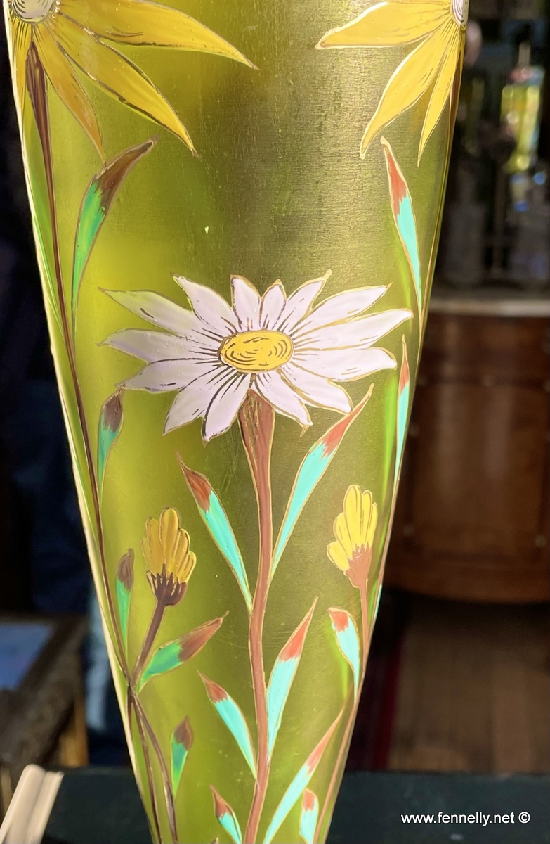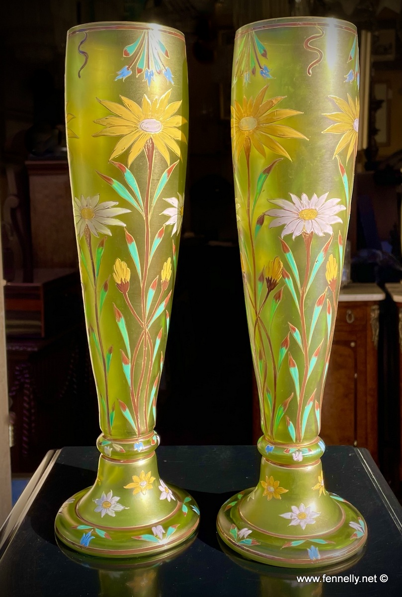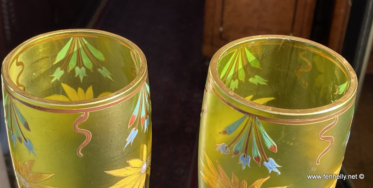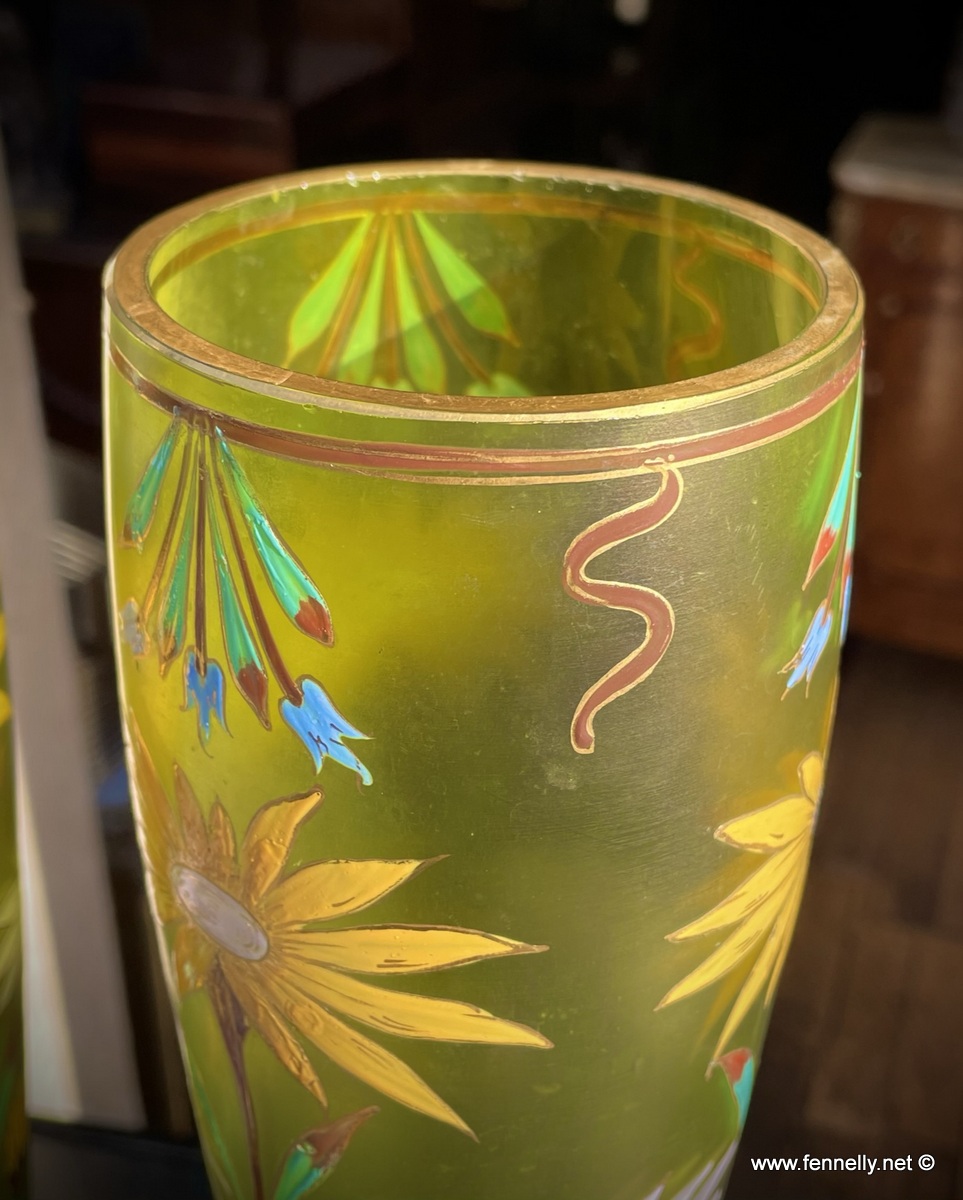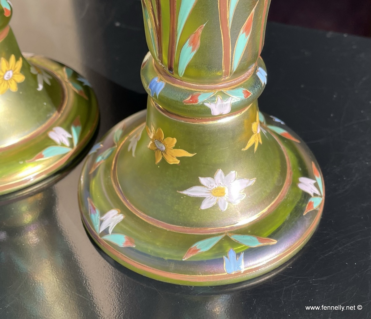 These are a beautiful Pair of Art Nouveau Hand Painted Vases made in Bohemia Circa 1890. They are of a large size and have stunning hand painted flowers on the green glass which react magically with the light and makes for a wonderful view.
