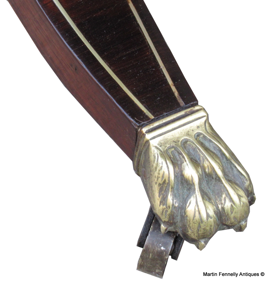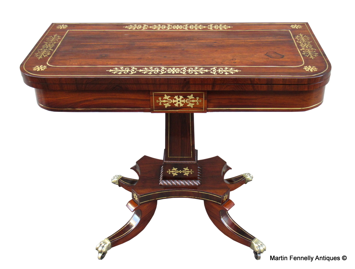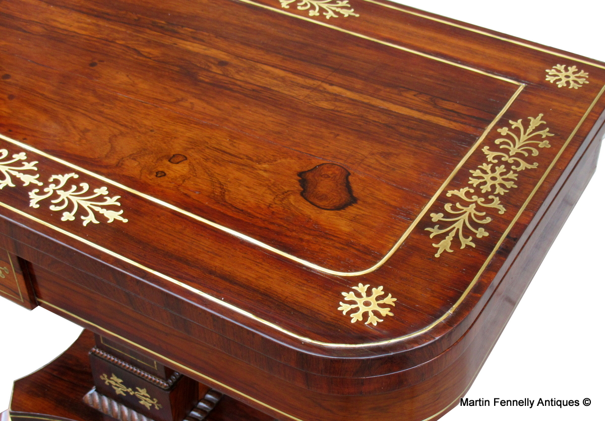 Superb Antique English Regency Rosewood Brass inlaid card table, Circa 1820. The top, frieze and base with reserves of brass inlay and stringing. There is no mistaking it’s unique quality and design, which is certain to make it a talking point in your home. It stands on four scrolled legs which terminate in their original brass caps and castors. This is a lovely piece of furniture.