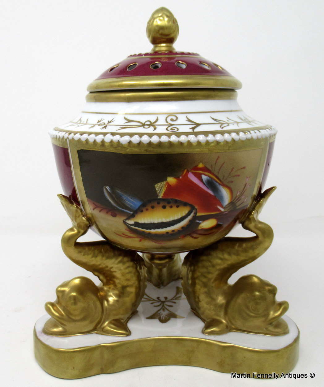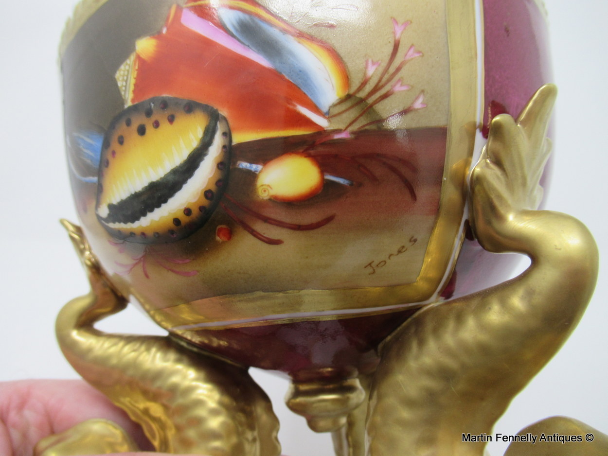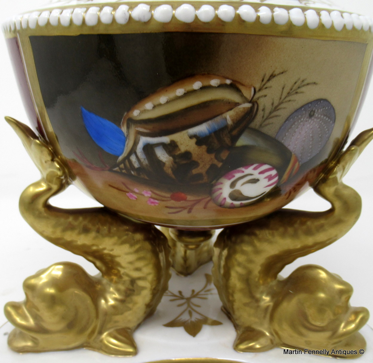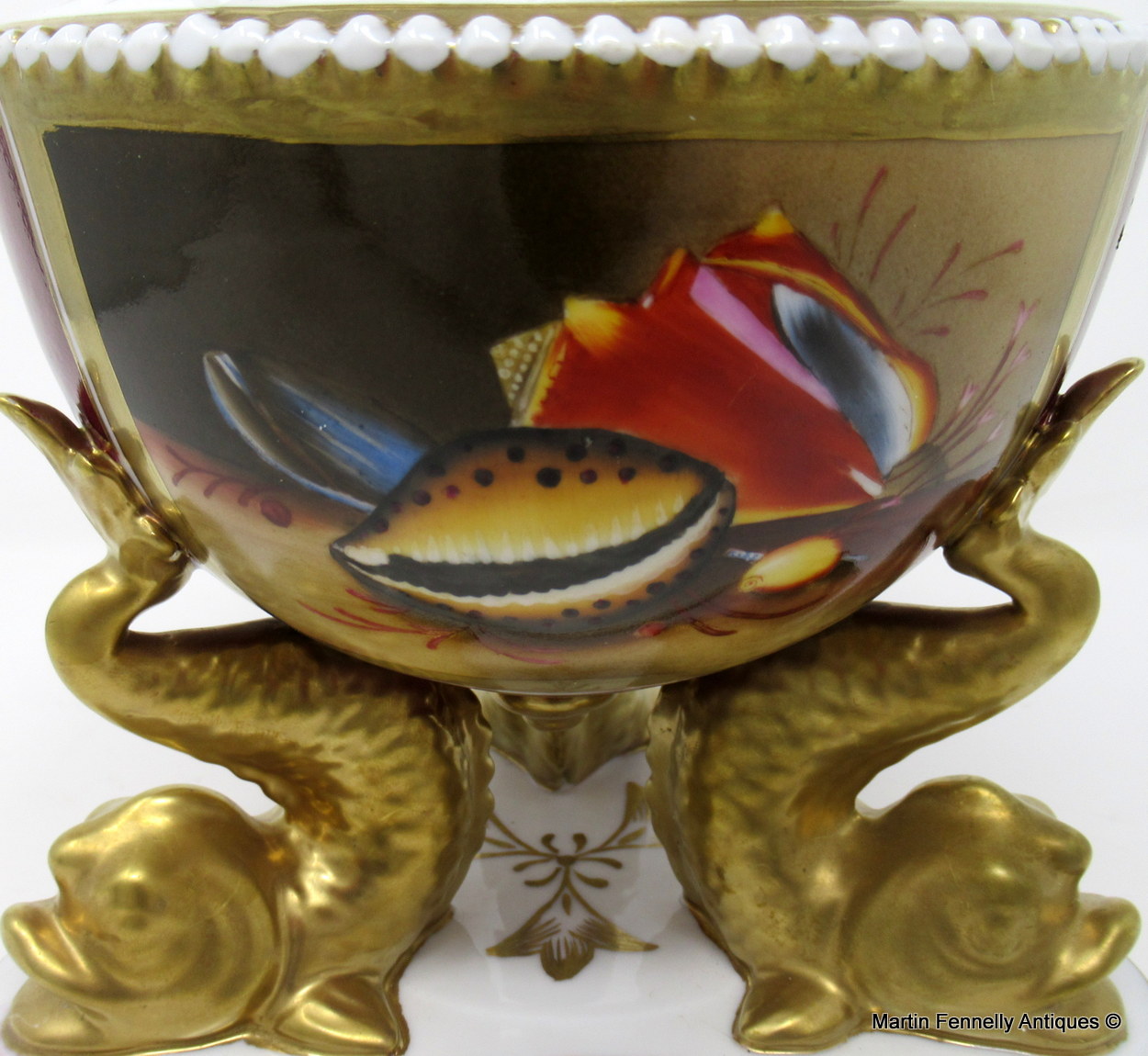 Lavishly hand decorated in colours depicting various Sea Shells on a burgundy ground each supported by three gilt Dolphins on triangular shaped base.