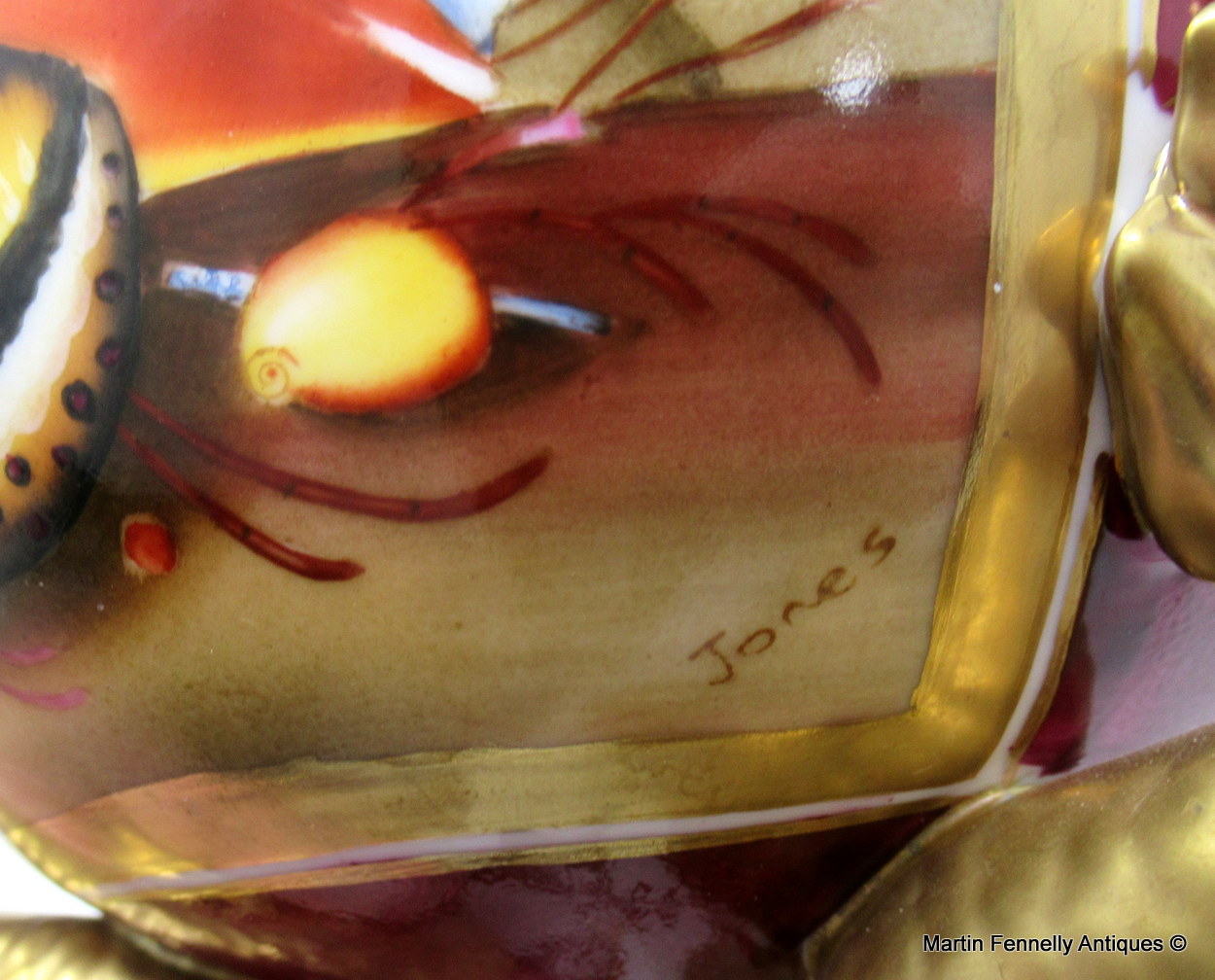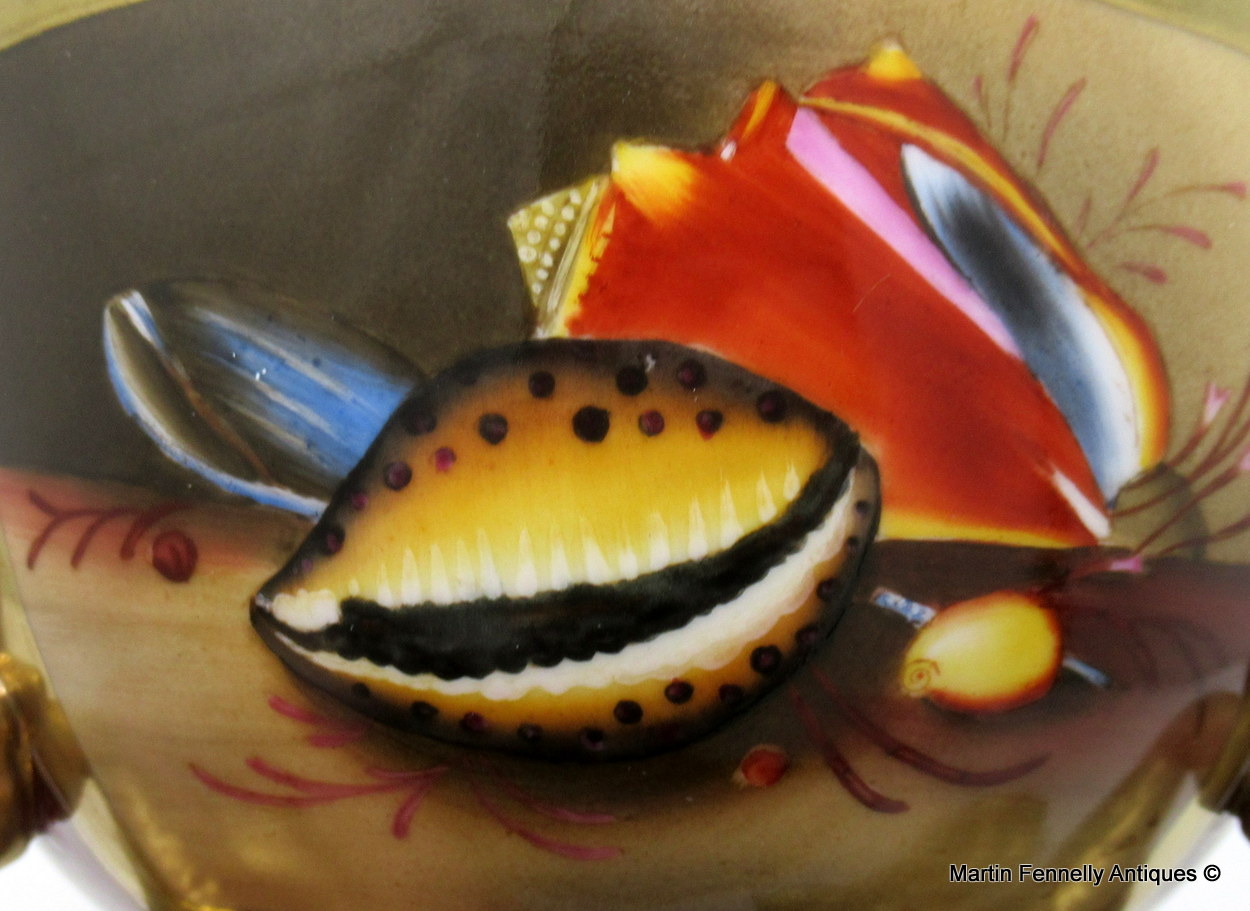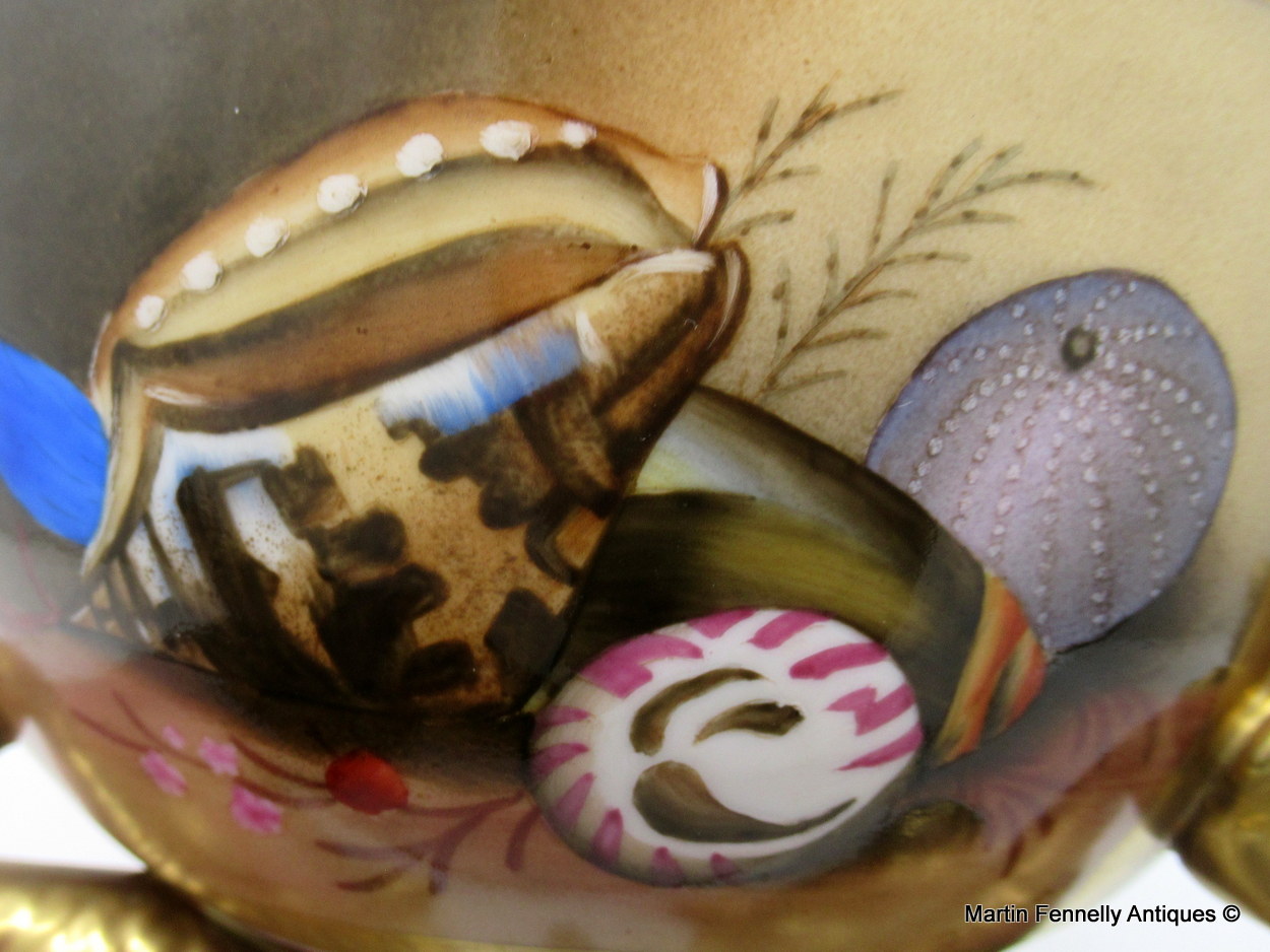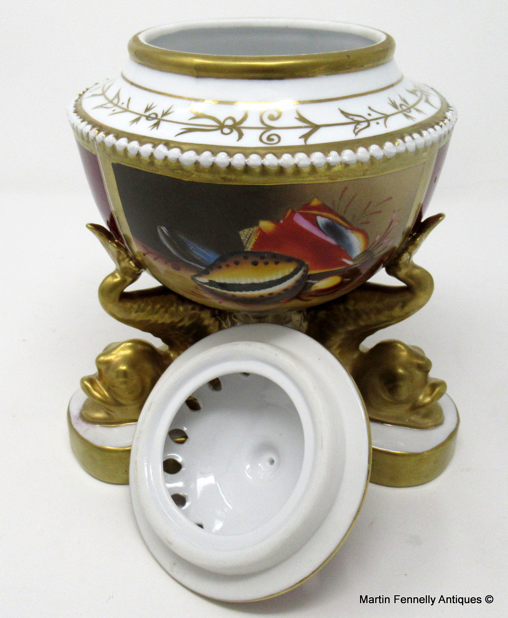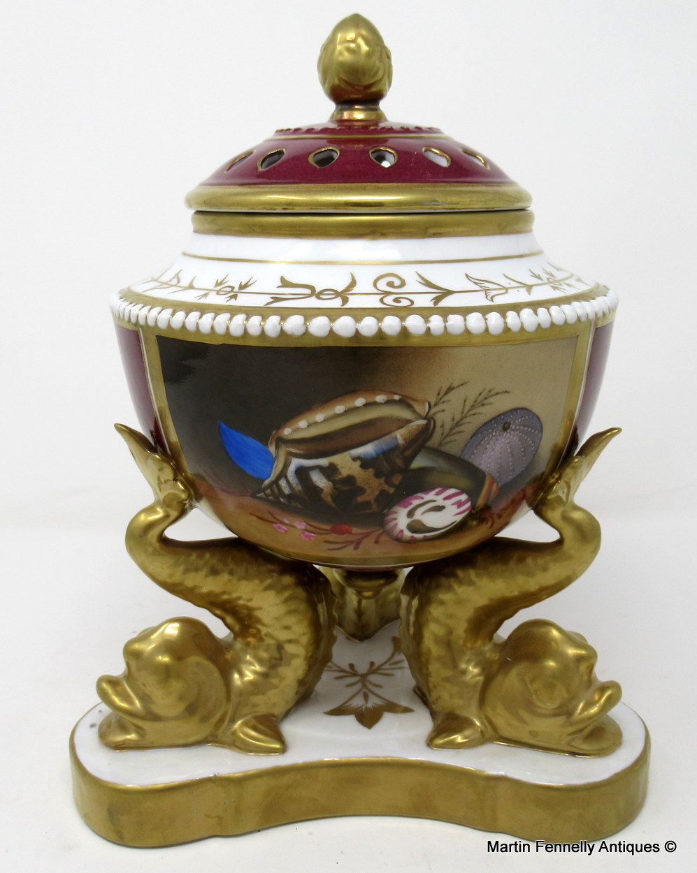 Lavishly hand decorated in colours depicting various Sea Shells on a burgundy ground each supported by three gilt Dolphins on triangular shaped base.