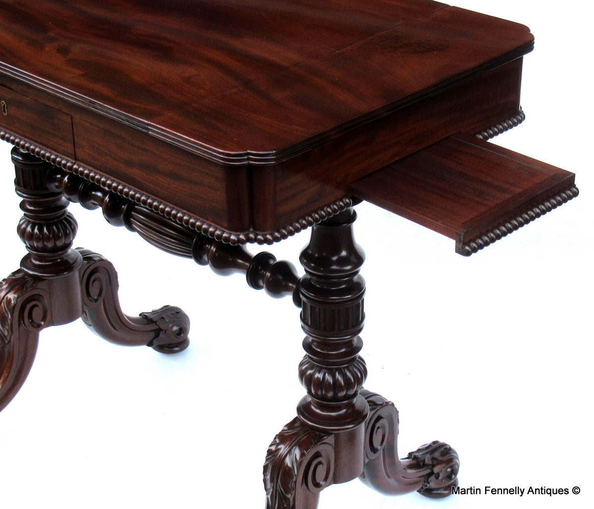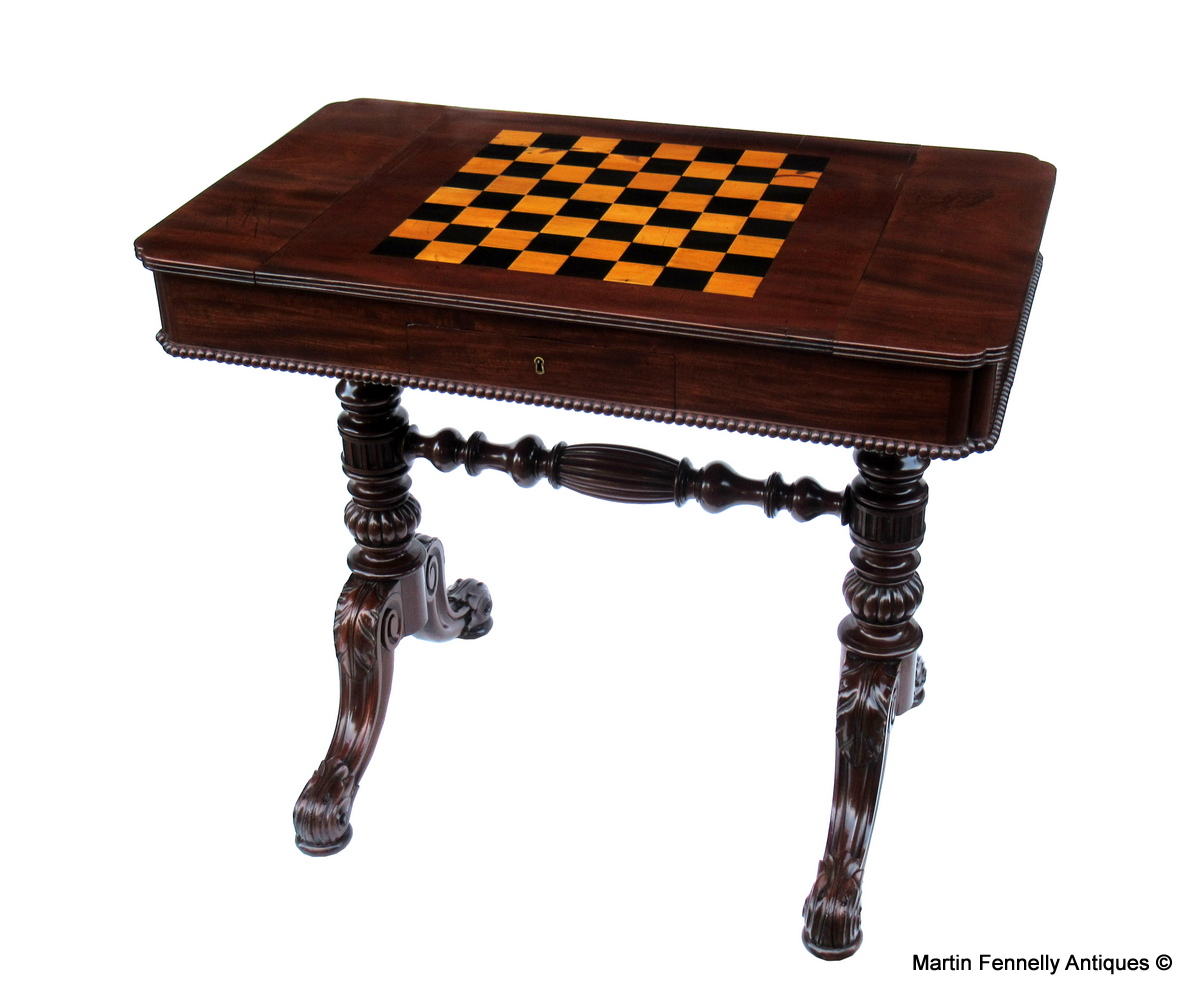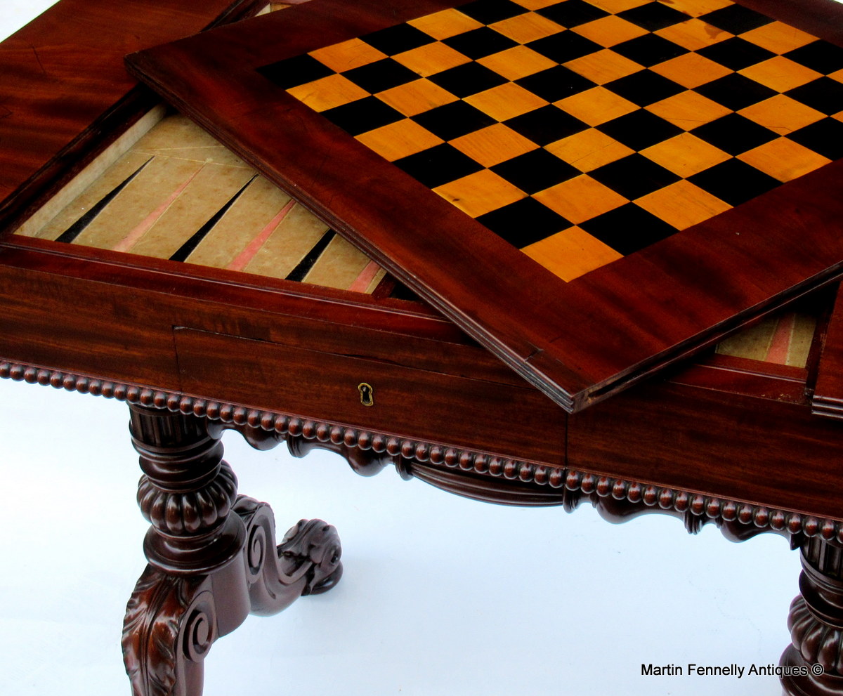 This is a Superb English, George IV period, carved Mahogany games table attributed to the famed Gillow’s of Lancaster workshop and was made Circa 1820. The table is a masterpiece of construction with inset removable and reversable game board which when removed reveals a backgammon playing surface. The rectangular shaped top is over a a shallow frieze with central drawer and Candlestick slides at each end (see images). Supported by Classically carved mahogany twin columns with turned stretcher all raised on acanthus carved downswept legs ending in paw feet with concealed casters. This table was probably a special commission for a client of noble distinction and the provenance is excellent. Related examples are noted in "Gillows of Lancaster and London" by Susan E. Stuart. The Table was polished by our Master Restorers (Lancaster Antiques) and they commented on the superior quality Mahogany which is used throughout the piece and the attention to detail on all aspects of the Table. Pieces by Gillows are very sought after and i was fortunate to locate this one in the UK.