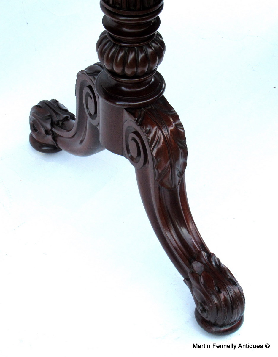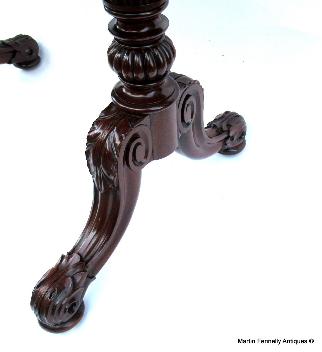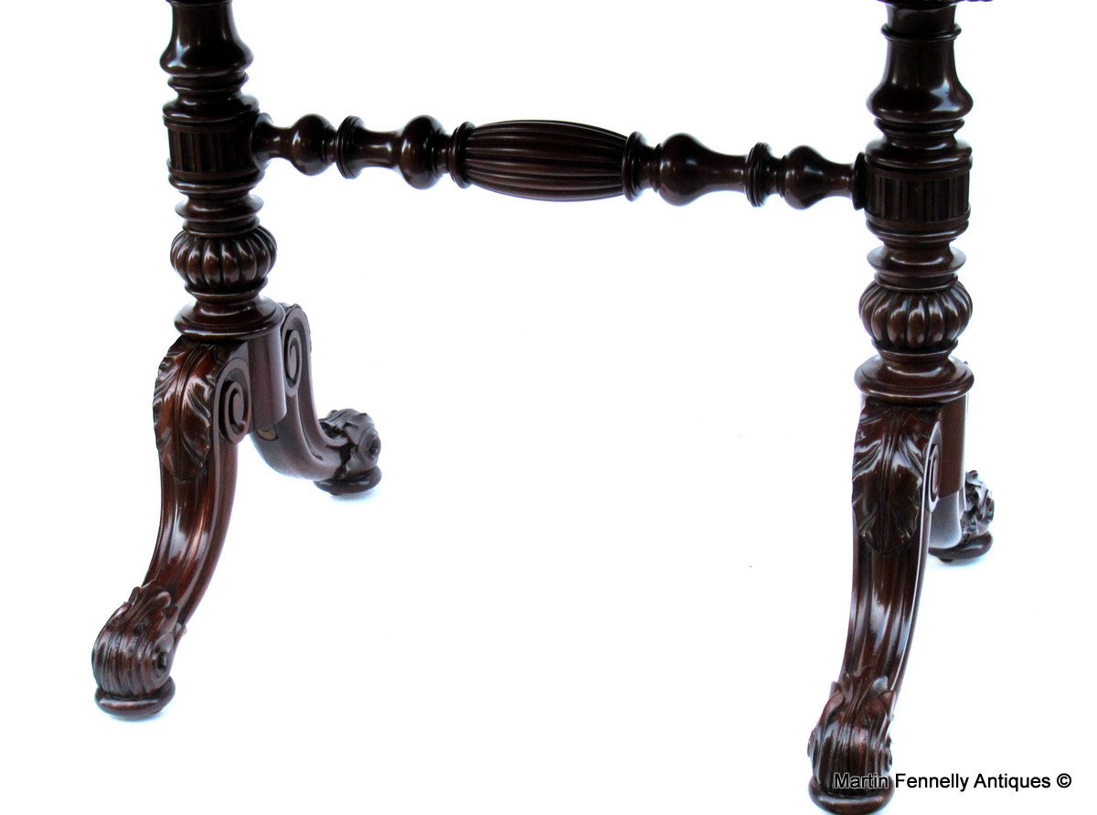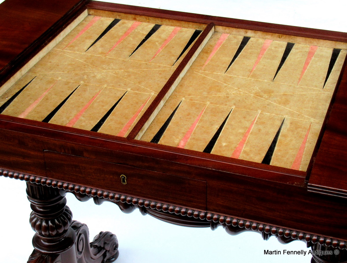 This is a Superb English, George IV period, carved Mahogany games table attributed to the famed Gillow’s of Lancaster workshop and was made Circa 1820. The table is a masterpiece of construction with inset removable and reversable game board which when removed reveals a backgammon playing surface. The rectangular shaped top is over a a shallow frieze with central drawer and Candlestick slides at each end (see images). Supported by Classically carved mahogany twin columns with turned stretcher all raised on acanthus carved downswept legs ending in paw feet with concealed casters. This table was probably a special commission for a client of noble distinction and the provenance is excellent. Related examples are noted in "Gillows of Lancaster and London" by Susan E. Stuart. The Table was polished by our Master Restorers (Lancaster Antiques) and they commented on the superior quality Mahogany which is used throughout the piece and the attention to detail on all aspects of the Table. Pieces by Gillows are very sought after and i was fortunate to locate this one in the UK.
