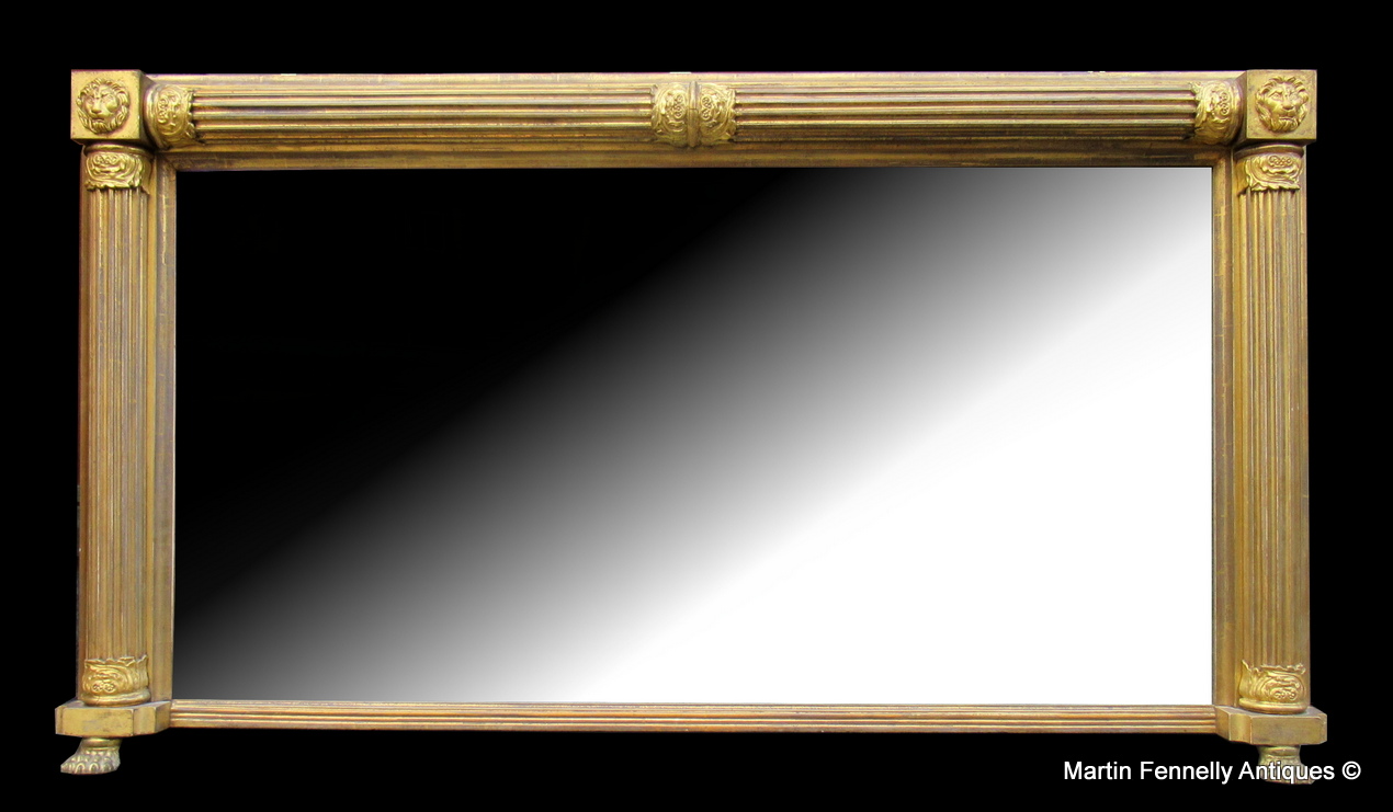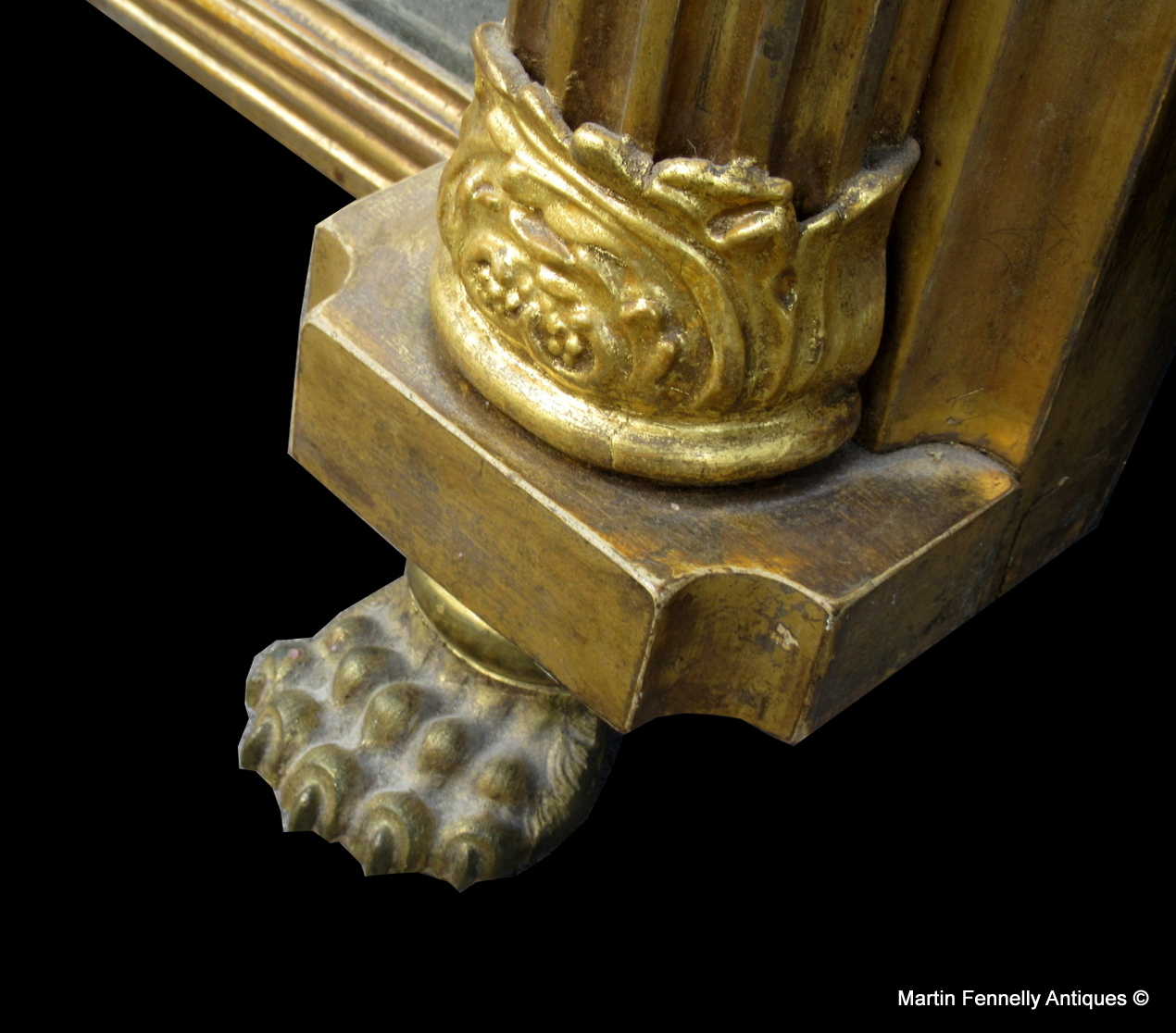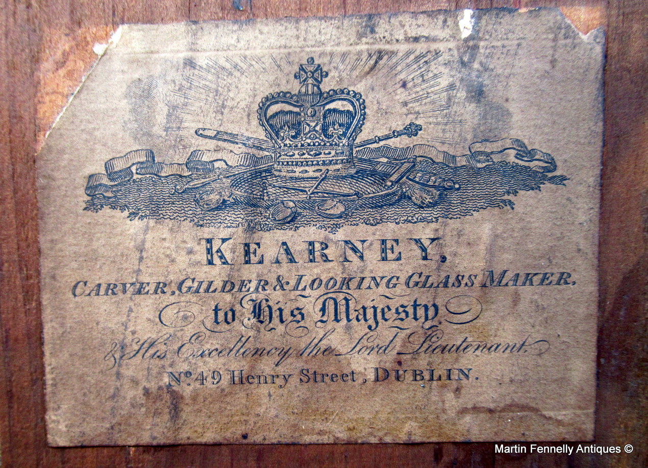 This Rare Irish Antique Overmantal has just arrived to my Gallery and the original Kearney Label still on the back. Joshua Kearney worked as a Gilder and Gilder in Dublin from 1797 to 1829. Kearney moved premises on 1804 to Henry Street from Great Britain Street (now Parnell Street). This Mirror is magnificently constructed by Kearney and has all the original detail intact. Reeded Columns with Lion Mask tops frame this mirror which is raised on the original metal cast claw feet. The Mirror was located here in Ireland in a Regency property and I was fortunate to locate this one.